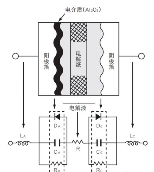 電容的等效電路作為鋁電解電容的電介質氧化膜(Al2O3)的介電常數通常為8~10,這個值并不比其他類型的電容大,但是,通過對鋁箔進行蝕刻擴大表面積,并使用電化學的處理得到更薄更耐壓的氧化電介質層,使鋁電解電容可以取得比其他電容器更大的單位面積CV值。